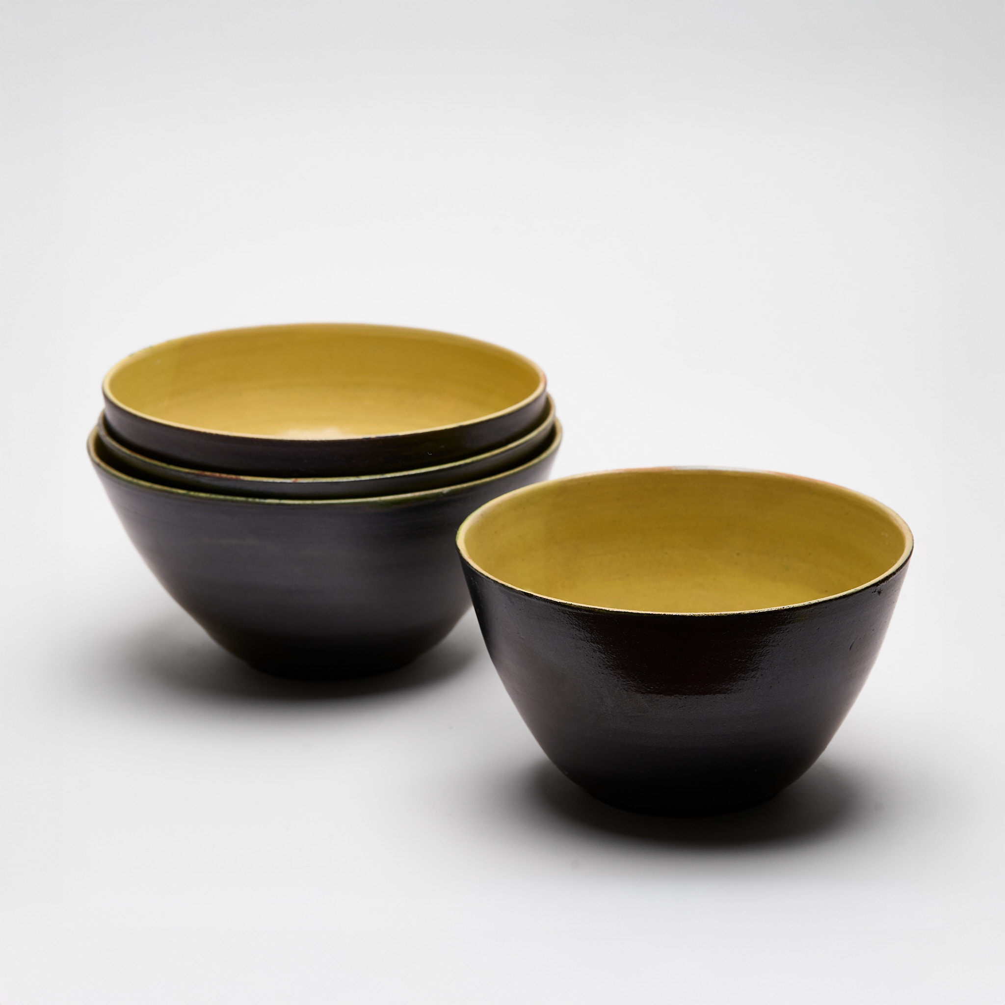 Dieses Set aus vier handgefertigten Steinzeugschalen verbindet moderne dunkle Aussenseiten mit warm gelb glasierten Innenflächen. Jede Schale ist ein Unikat und kann deswegen in Form und Grösse leicht variieren. Sie eignet sich perfekt für Müsli, Snacks oder kleine Gerichte. Robust, langlebig und spülmaschinenfest. Ideal für den täglichen Gebrauch.