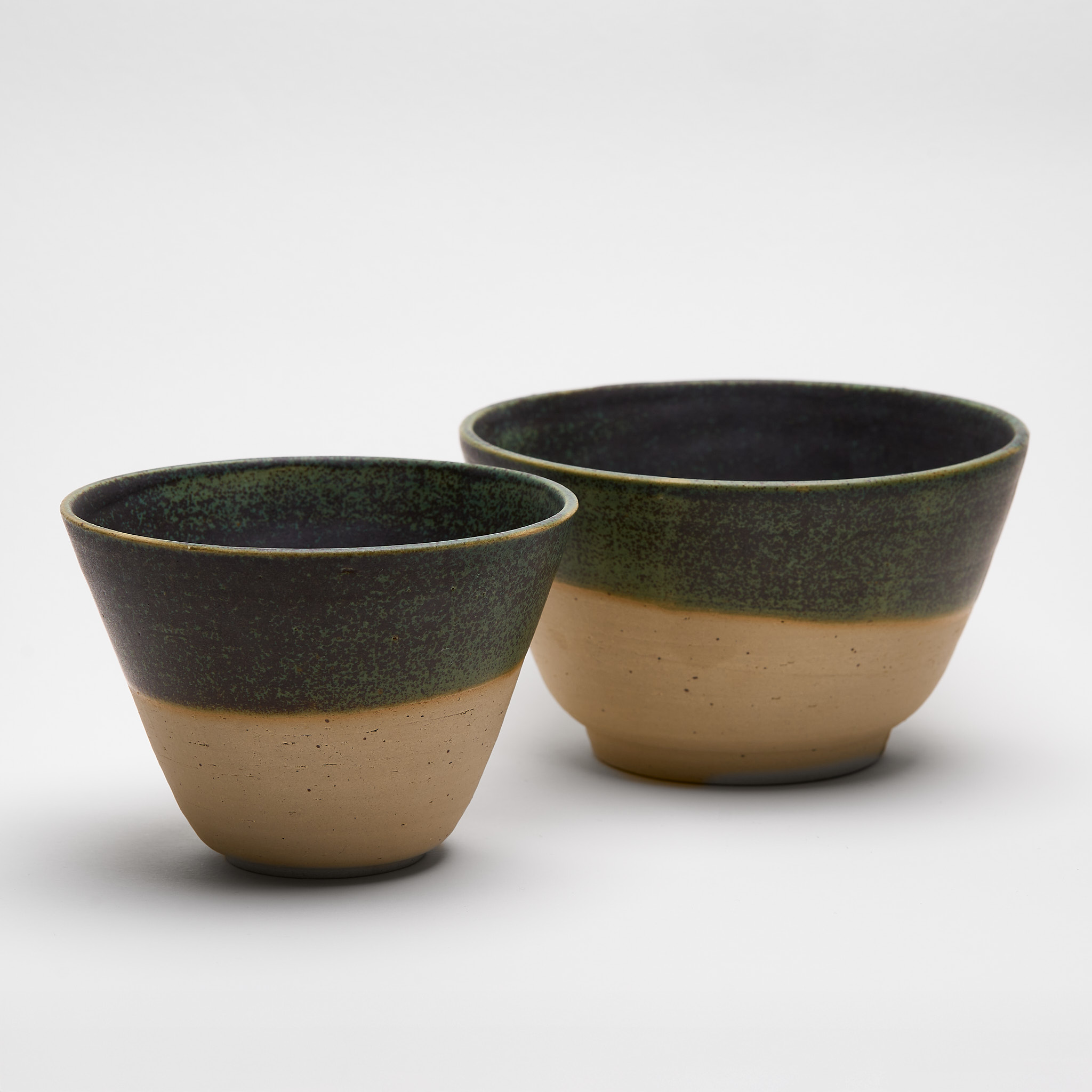 Zwei handgefertigte Keramikschalen aus Steinzeug mit naturbelassenem Ton und grün kupfernen Glasur. Aussenseite halbglasiert, innen ganz. Ideal für Tee oder Snack. Preis beinhaltet beide Schalen.